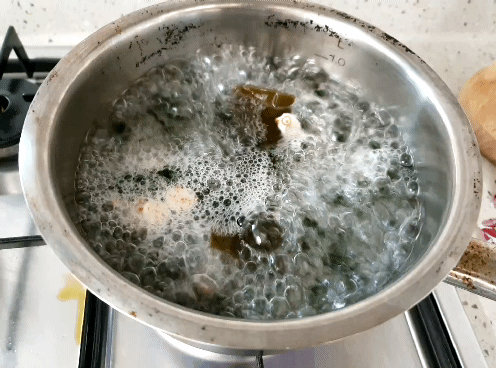 그 다음, 건더기 스프를 투하 해줍니다. 물이 아주 잘 끓고 있군요!
