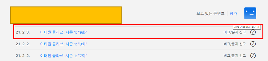 오른쪽 끝 시청기록에서 숨기기 탭이 있습니다. 여기서 클릭 하시면 시청기록이 숨겨지게 됩니다!