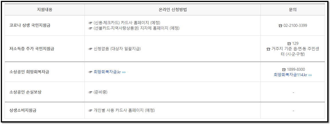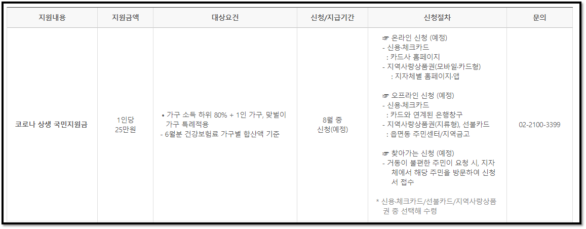 - 온라인 신청방법 : 신용, 체크카드사 홈페이지 또는 지역사랑 상품권으로 받기 원할 시 지자체 홈페이지 참조