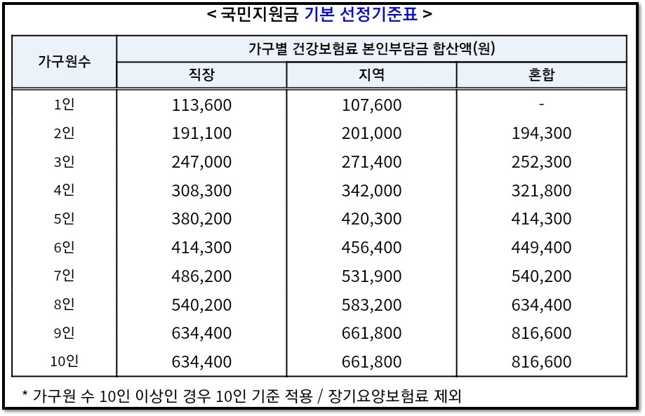 ▶ 가구별 건강보혐료 합산액이 "기본선정기준표"에 표시된 건강보혐료 본인부담금 이하인 경우