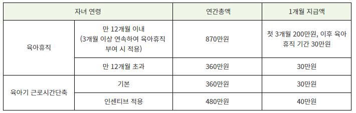 - 육아기 근로시간 단축: 매월 30만원 (인센티브 적용 시 월 40만원, 연 480만원)