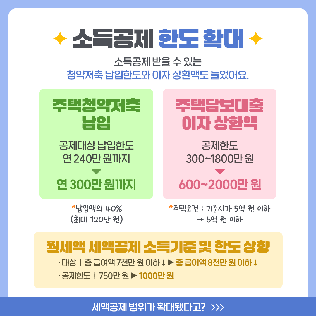 - 공제 한도: 300~1800만 원 → 600~2000만 원
