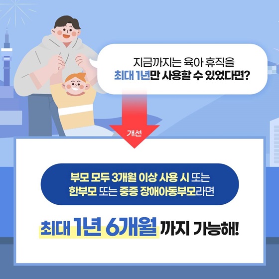 - 기존 육아휴직 기간은 부모 1명당 육아휴직은 최대 1년이었지만, 이제 부모가 각각 3개월 이상 육아휴직을 사용할 경우, 육아휴직 기간을 최대 1년 6개월까지 연장할 수 있습니다.