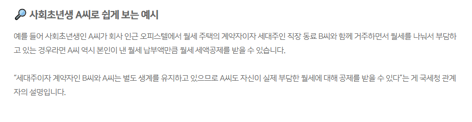 예를 들어, 계약자인 세대주와 함께 월세 주택에 거주하며 실제로 월세를 분담하는 근로자라면, 계약자와 근로자가 각각 부담한 월세 금액에 대해 세액공제를 받을 수 있습니다.