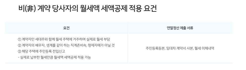 - 계약자(세대주)의 배우자, 또는 계약자와 생계를 함께하는 직계존속(부모, 조부모 등), 직계비속(자녀, 손자녀), 형제자매의 경우, 월세를 함께 부담하더라도 세액공제를 받을 수 없습니다.