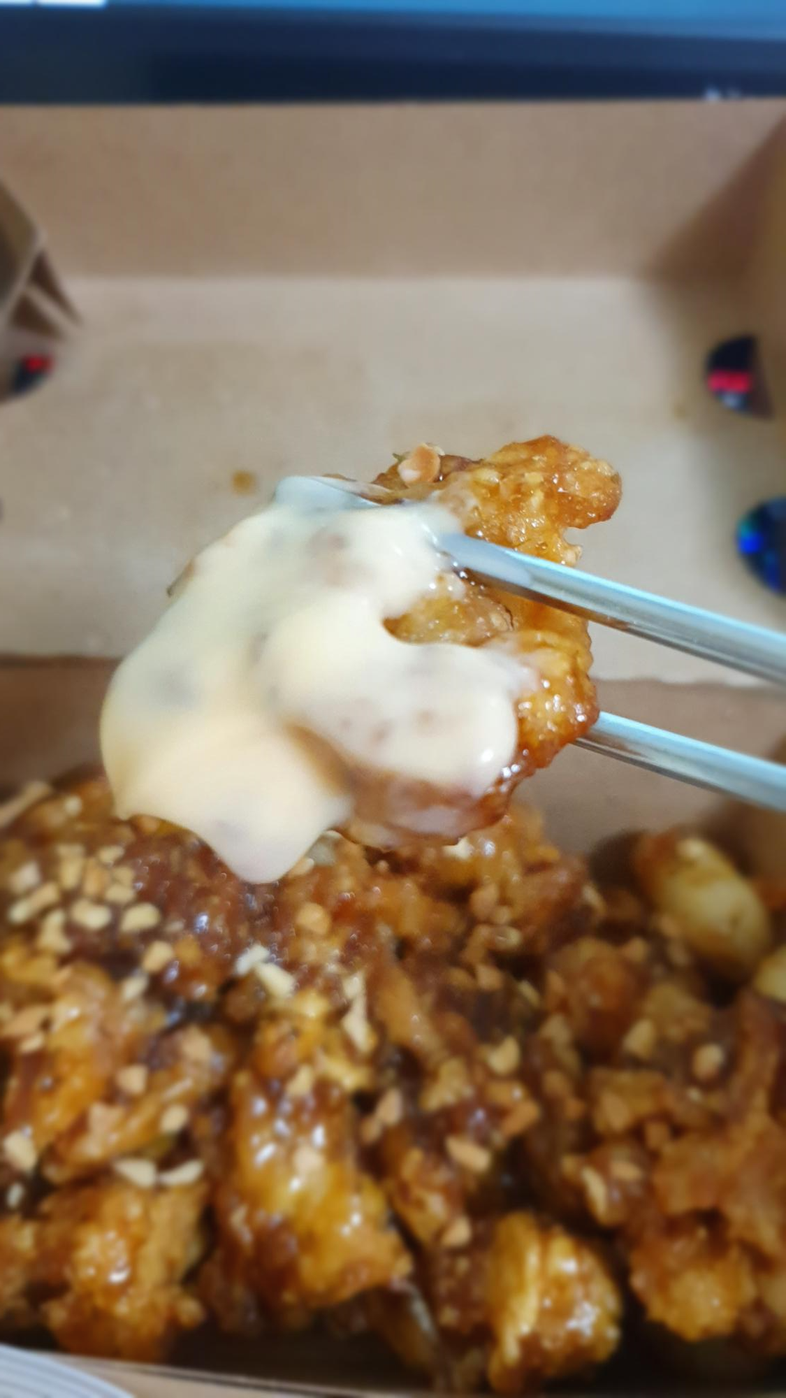 이제 얘를 뜯어서 치킨을 콕 찍어 한입 먹어보겠습니다!!ㅋㅋ