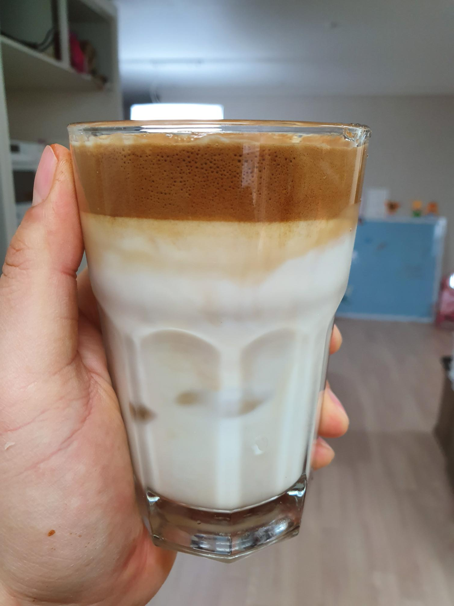 그런데 처음 접해본 도구로 인해 대참사가 발생하는데 .... 등짝스매싱 한대 맞고 완성한 달고나 라떼 맛은 좋더군요! ㅋ간단하니 여러분들께서도 집에서 쉽게 한잔씩 만들어서 드셔보시길 바랍니다.!