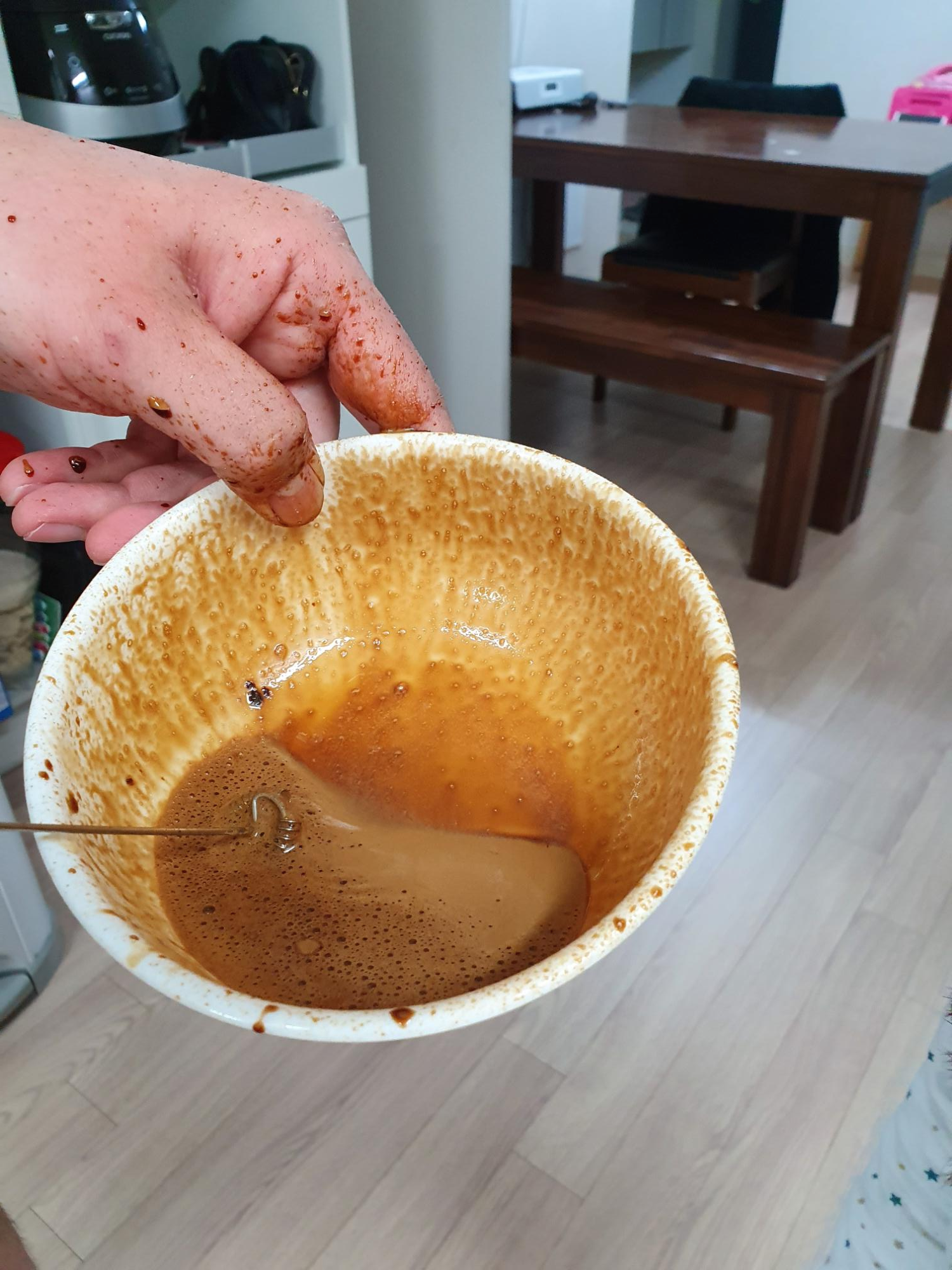 제 손은 커피 범벅이 되었습니다 ... 여기서 요.알.못 티가 확 나버린거죠 ....ㅋㅋ 애초에 튈 것을 예상하고 볼이 깊은 용기에 시도했어야 했는데 생각이 짧았습니다. 여러분들은 이런 실수 하지마세요, 등짝스매싱 날라옵니다 ;;;ㅋㅋ